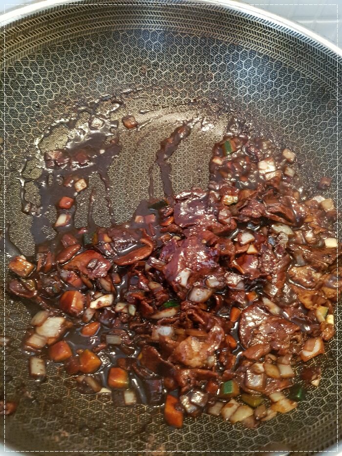 구운 돼지고기에 야채를 넣어 달달달 볶아줍니다.